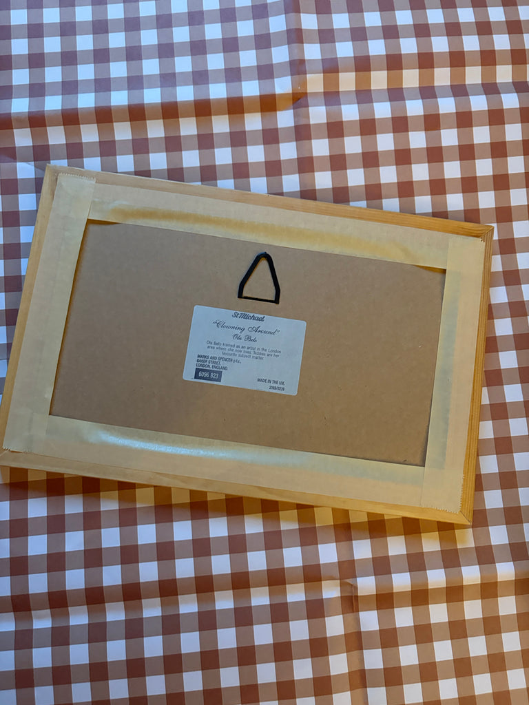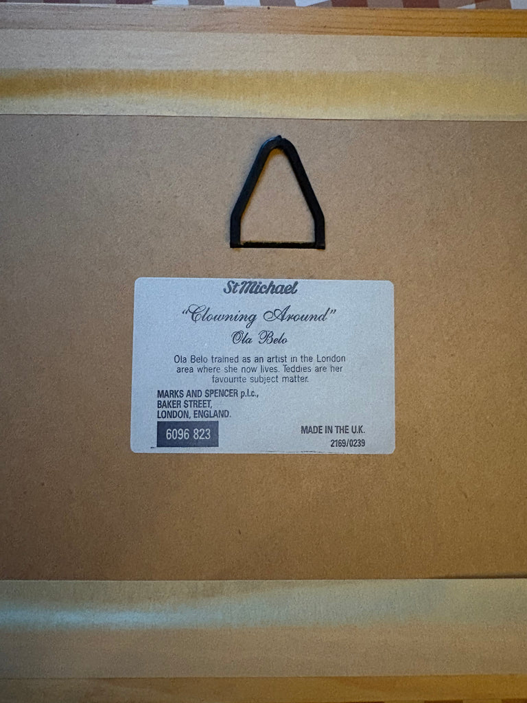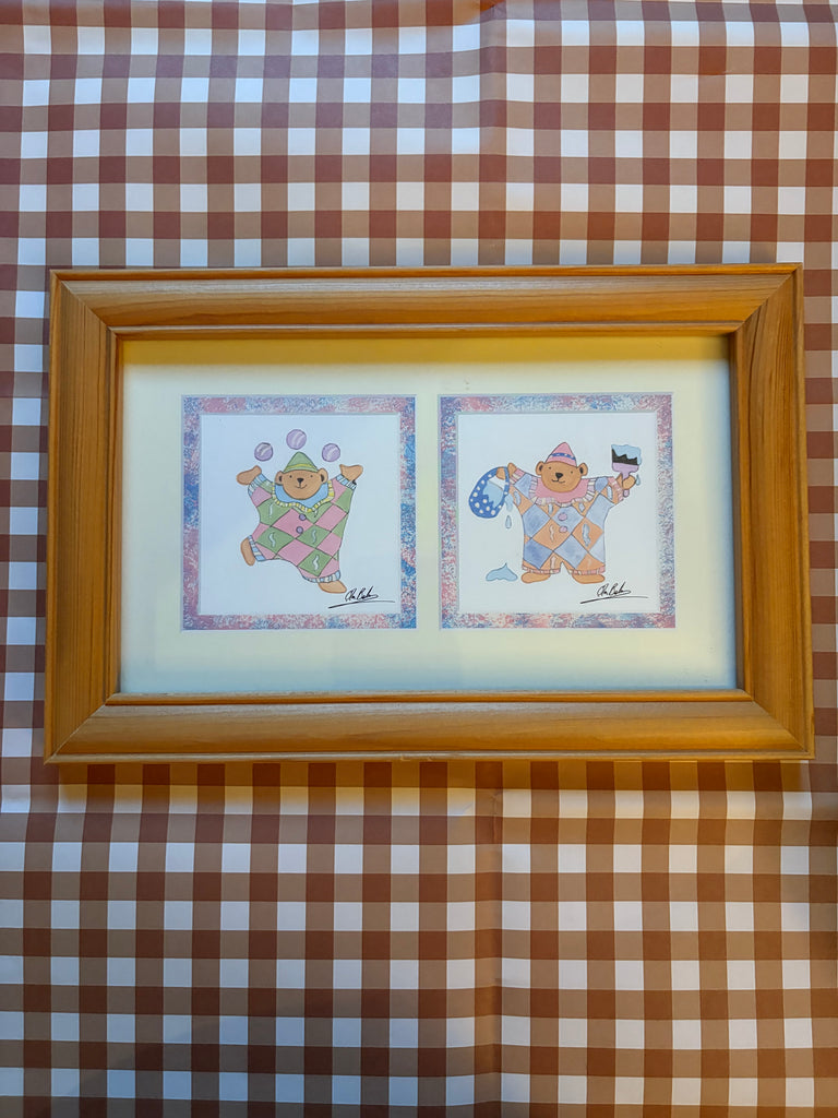 Framed prints featuring friendly clown teddy bears.